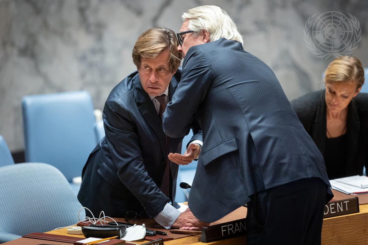 Tor Wennesland (right), Special Coordinator for the Middle East Peace Process, speaks with Nicolas de Rivière, Permanent Representative of France to the United Nations and President of the Security Council for the month of September, ahead of the Security Council meeting on the situation in the Middle East, including the Palestinian question.