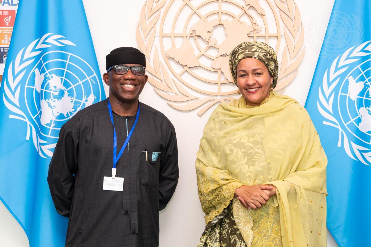 Deputy Secretary-General Amina Mohammed (right) meets with Bankole Adeoye, African Union Commissioner for Political Affairs, Peace and Security.