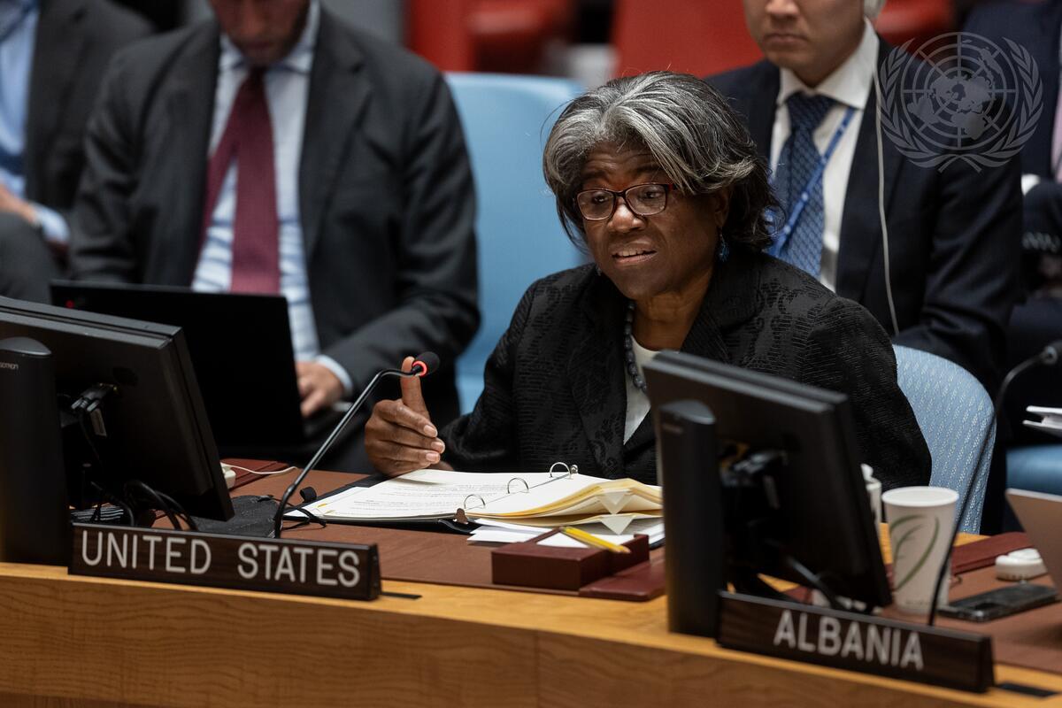 Linda Thomas-Greenfield, Permanent Representative of the United States to the United Nations, addresses the Security Council meeting on maintenance of peace and security in Ukraine.
