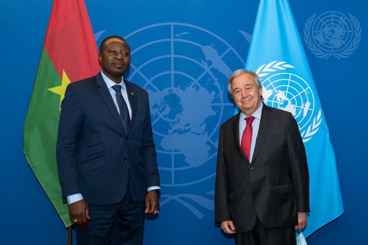 Secretary-General António Guterres (right) meets with Paul Henri Sandaogo Damiba,