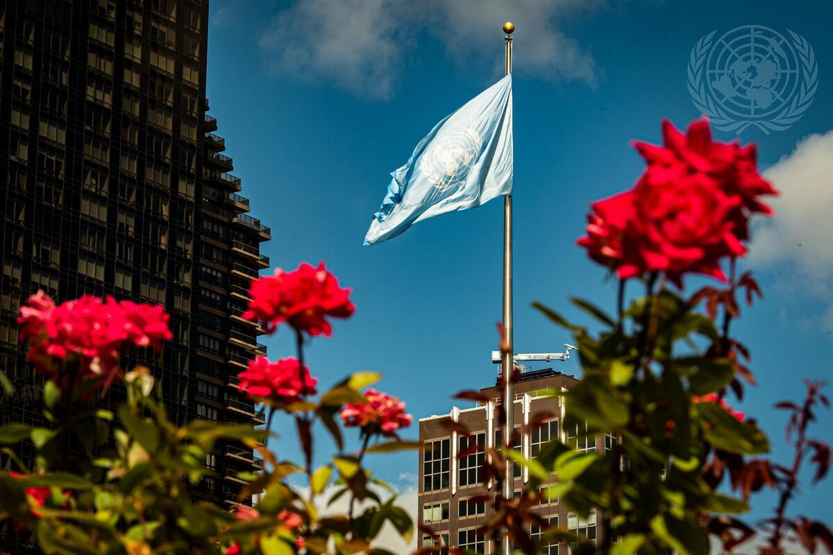 A view of the United Nations flag seen from the Rose Garden at UN Headquarters.