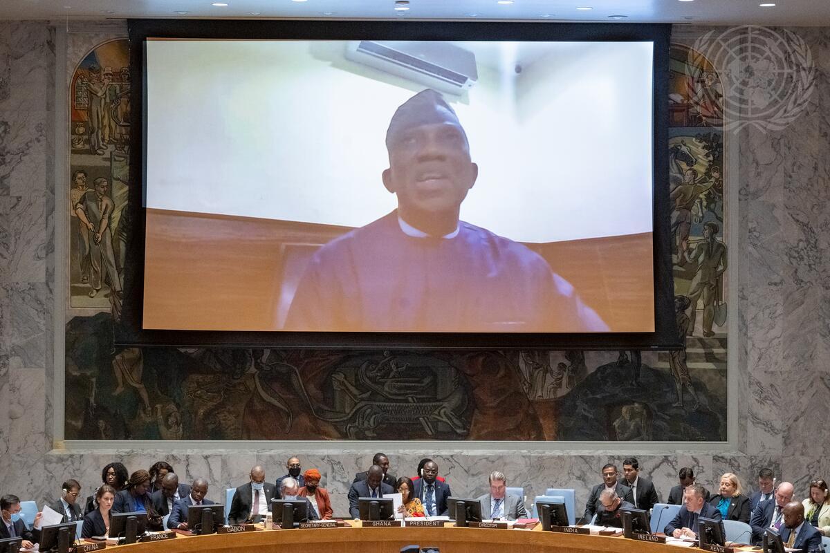 Bankole Adeoye (on screen), Commissioner for Political Affairs and Peace and Security (PAPS), of the African Union Commission, briefs the Security Council meeting on peacebuilding and sustaining peace, with a focus on integrating effective resilience-building in peace operations for sustainable peace.