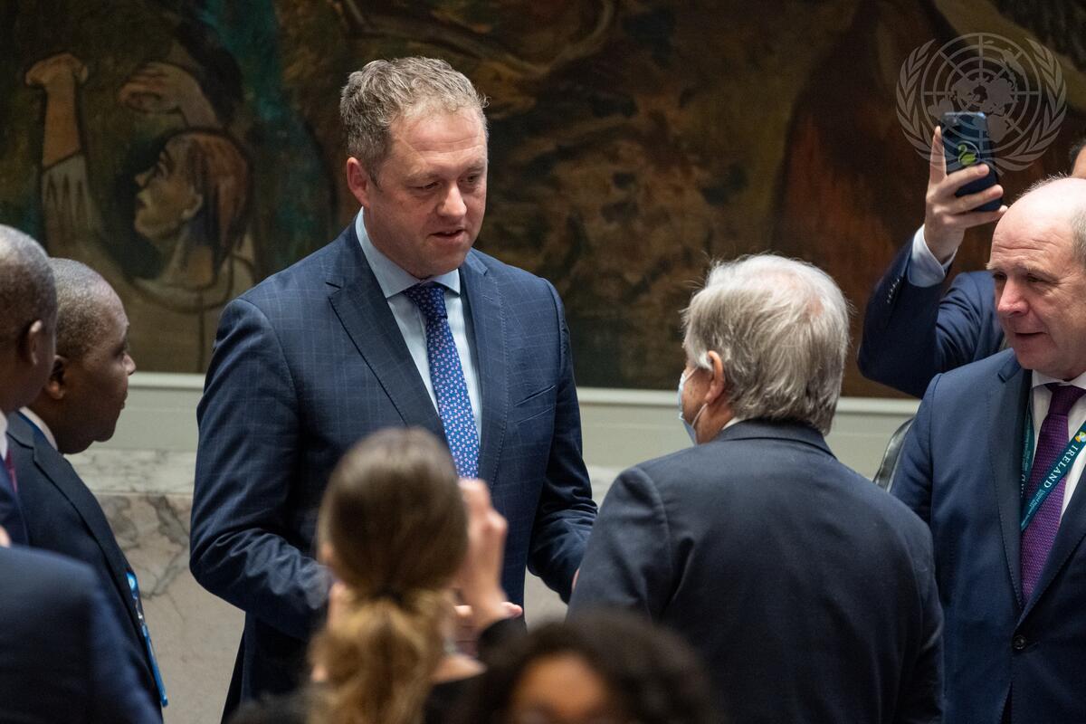 Secretary-General António Guterres (second from right with back to camera) speaks with Thomas Byrne, Minister of State for European Affairs of Ireland, ahead of the Security Council meeting on peacebuilding and sustaining peace, with a focus on integrating effective resilience-building in peace operations for sustainable peace.