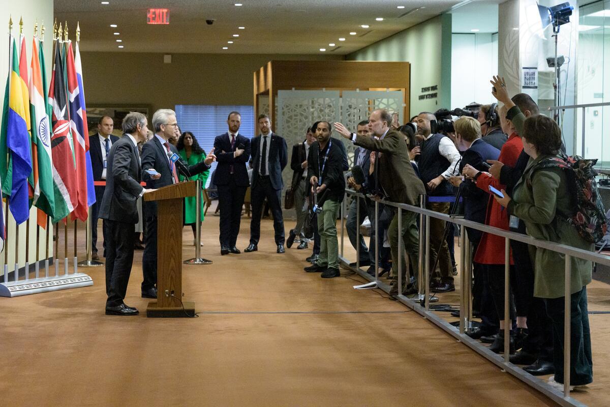 Rafael Mariano Grossi (at podium), Director General of the International Atomic Energy Agency (IAEA), briefs reporters at UN Headquarters.