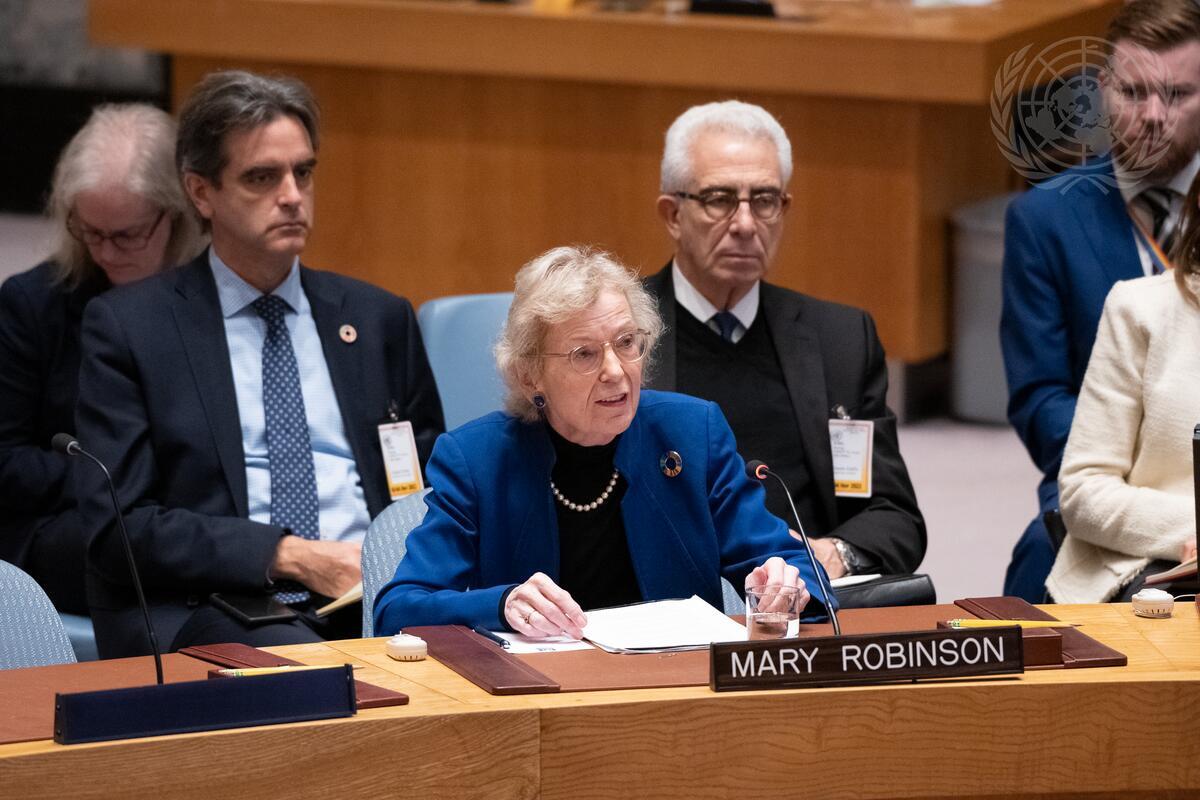 Mary Robinson, Chair of the Elders, briefs the Security Council meeting on peacebuilding and sustaining peace, with a focus on integrating effective resilience-building in peace operations for sustainable peace.