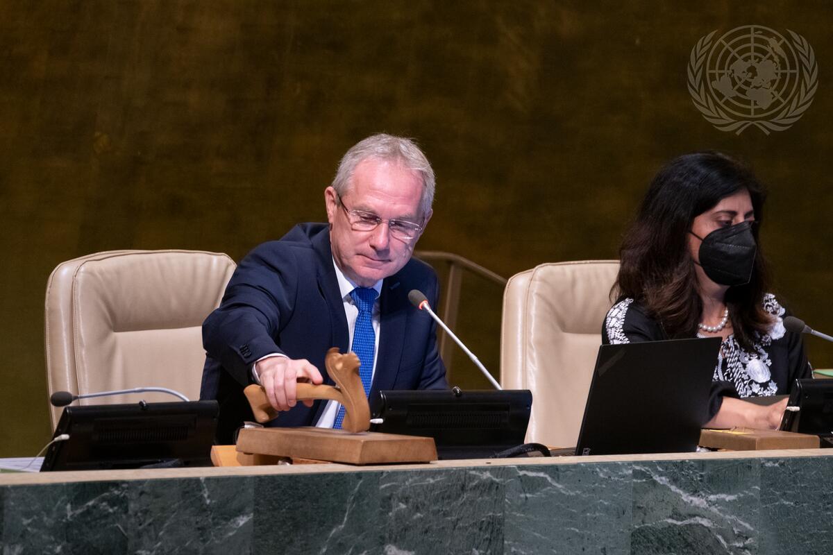 Csaba Kőrösi, President of the seventy-seventh session of the United Nations General Assembly, chairs the General Assembly meeting that heard a report of the Human Rights Council.