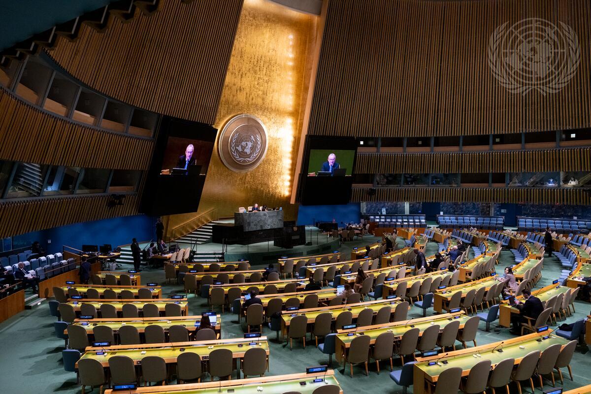 A wide view of the General Assembly meeting that heard a report of the Human Rights Council. On the screens and at dais is Csaba Kőrösi, President of the seventy-seventh session of the United Nations General Assembly.