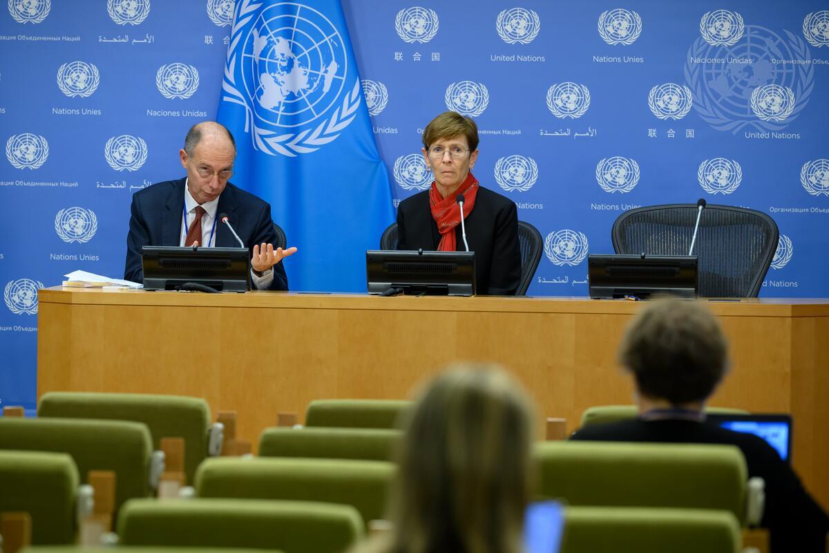 Judge Joan E. Donoghue (right), President of the International Court of Justice, and Philippe Gautier, Registrar of the Court, brief reporters at UN Headquarters.