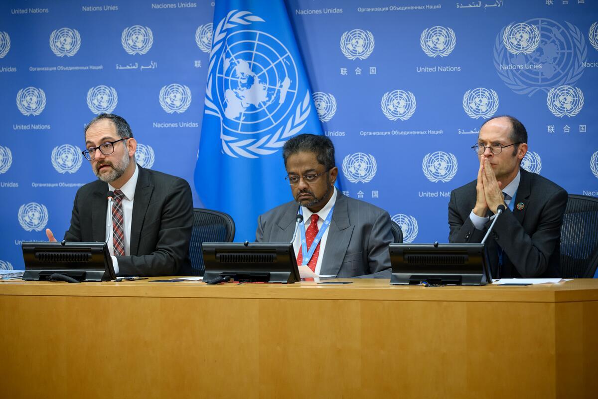 Press Briefing by Michael Fakhri (left), Special Rapporteur on the right to food; Balakrishnan Rajagopal (centre), Special Rapporteur on adequate housing as a component of the right to an adequate standard of living, and on the right to non-discrimination in this context, and Olivier De Schutter, Special Rapporteur on extreme poverty and human rights.