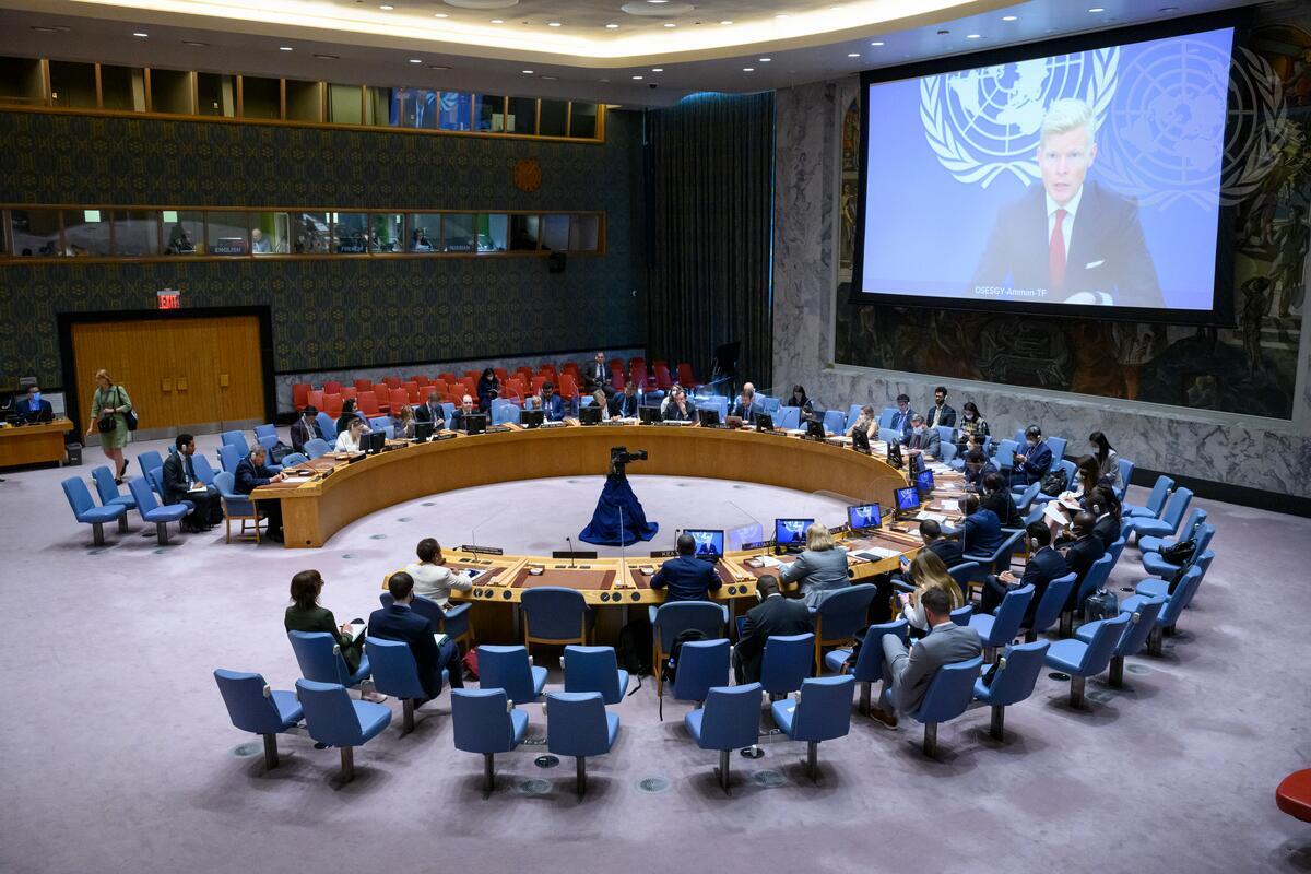 Hans Grundberg (on screen), Special Envoy of the Secretary-General for Yemen, briefs the Security Council meeting on the situation in the Middle East (Yemen).