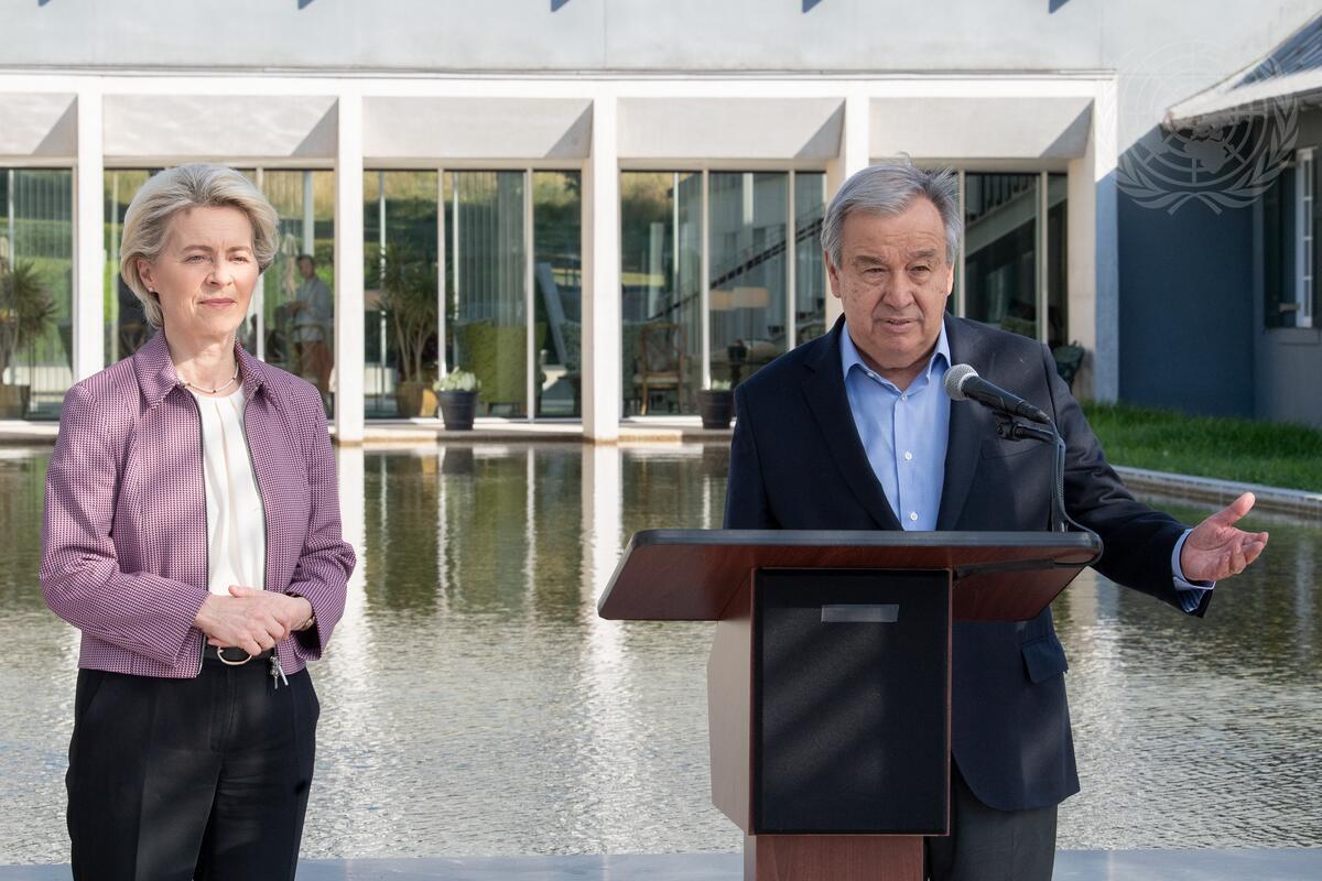 Secretary-General António Guterres (right) briefs reporters together with Ursula von der Leyen, President of the European Commission, during the European Union – United Nations high-level dialogue in Greentree, New York.