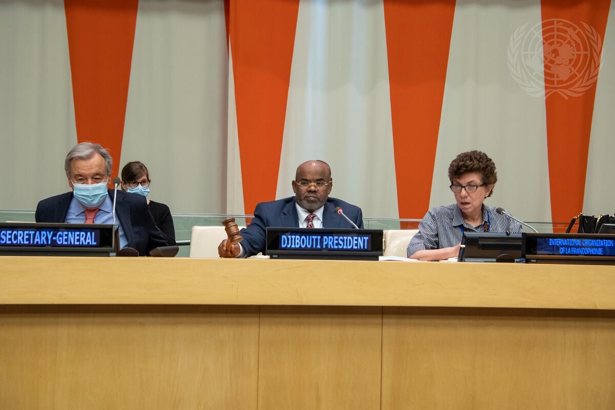 Mohamed Siad Doualeh (centre), Permanent Representative of the Republic of Djibouti to the United Nations, chairs the meeting with the Group of Francophone Ambassadors. At left is Secretary-General António Guterres.