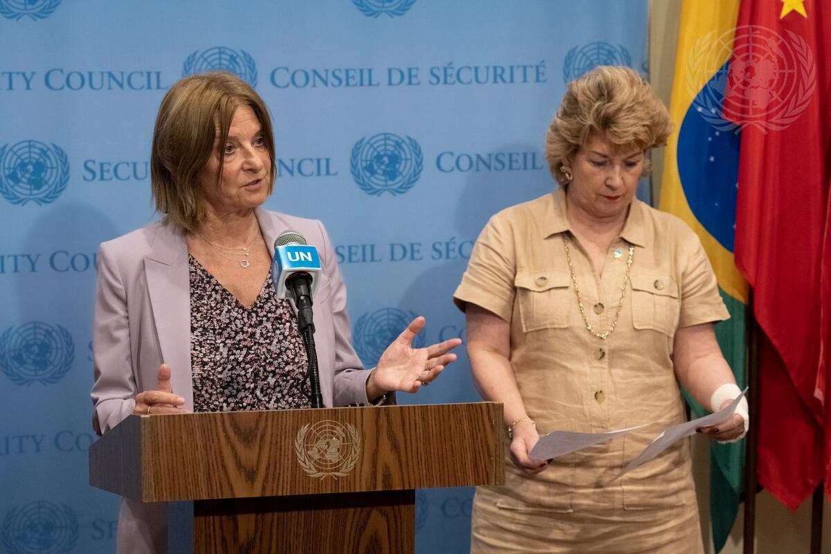 Mona Juul (left), Permanent Representative of Norway to the United Nations, briefs reporters after the Security Council meeting on the situation in the Middle East.