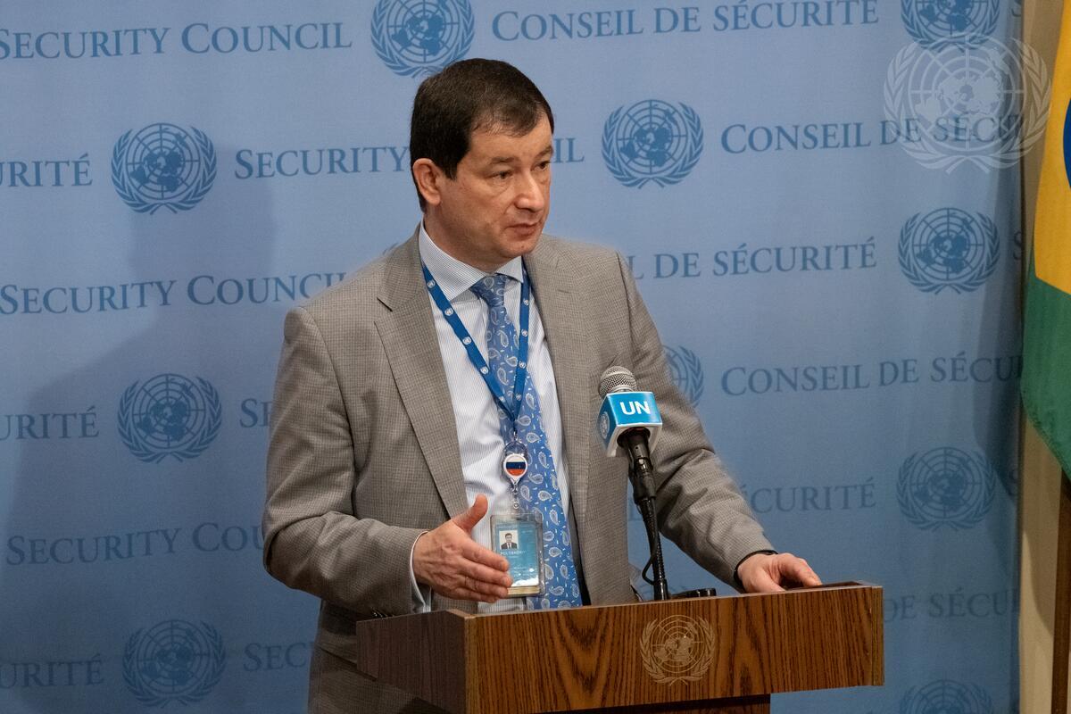 Dmitry A. Polyanskiy, Deputy Permanent Representative of the Russian Federation to the United Nations, briefs reporters after the Security Council meeting on the situation in the Middle East.
