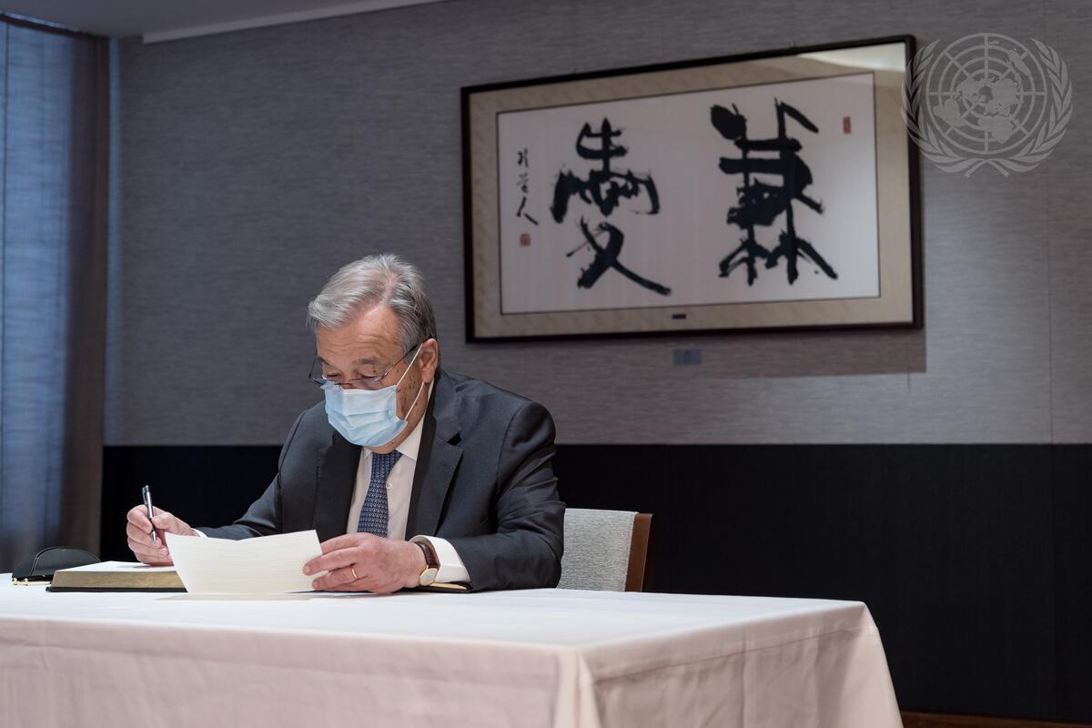 Secretary-General Signs Book of Condolences in Memory of Former Prime Minister of Japan