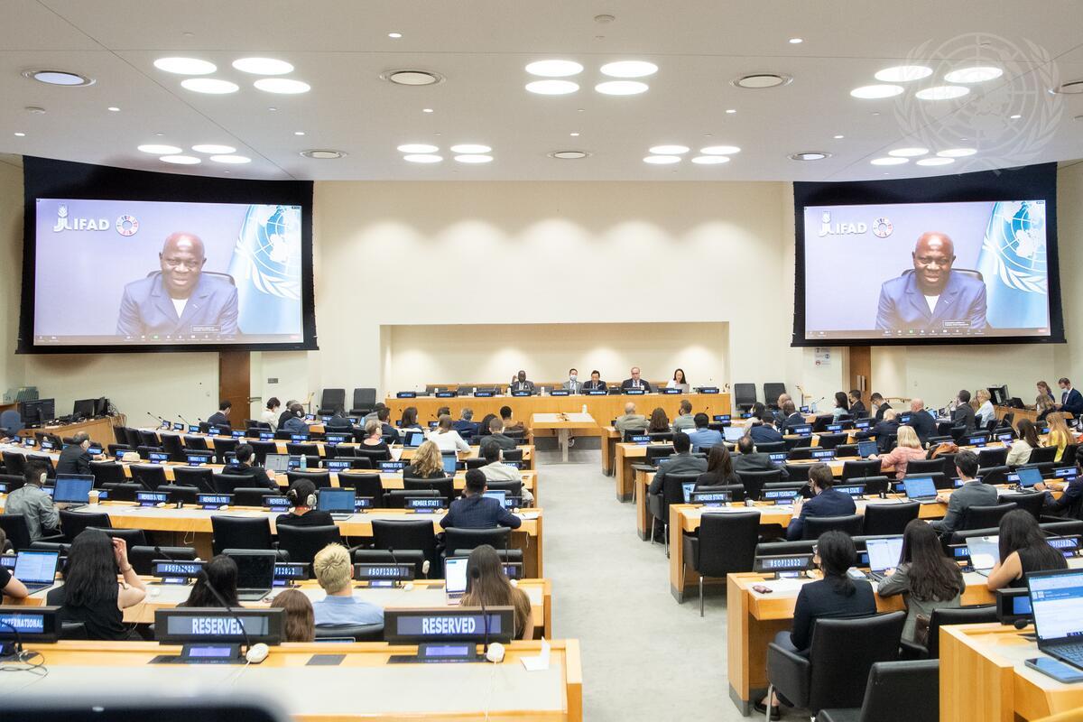 Gilbert F. Houngbo (on screens), President of the International Fund for Agricultural Development (IFAD), addresses the launch of The State of Food Security and Nutrition in the World (SOFI) 2022 on the theme “Repurposing food and agricultural policies to make healthy diets more affordable”.