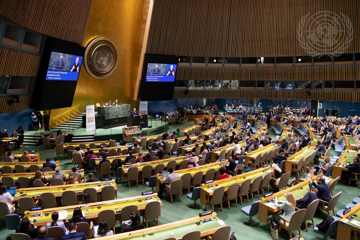 A wide view of the room as Secretary-General António Guterres (on screens and at podium) addresses the opening of the high-level political forum on sustainable development convened under the auspices of the Economic and Social Council 2022 session (5-15 July). The Forum is held on the theme: “Building back better from the coronavirus disease (COVID-19) while advancing the full implementation of the 2030 Agenda for Sustainable Development”.