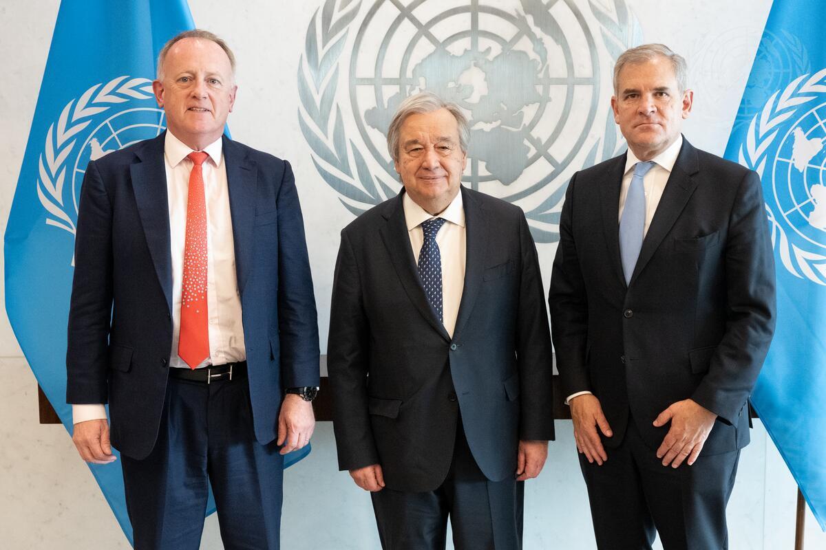 Secretary-General António Guterres (right) meets with John Neal (left), Chief Executive Officer of Lloyds of London, and Bruce Carnegie-Brown, Chairman of Lloyds of London.