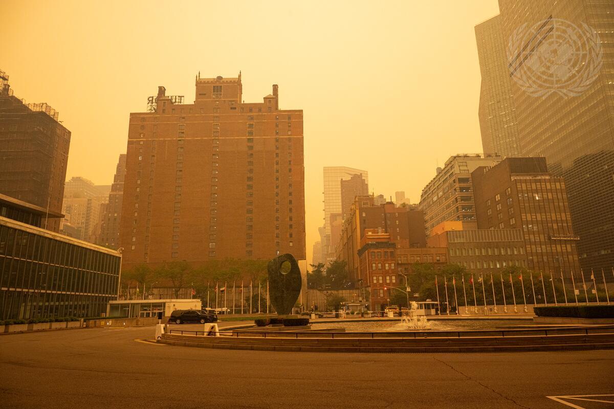 A view from UN Headquarters towards First Avenue and Tudor City in haze due to smoke from Canadian wildfires.