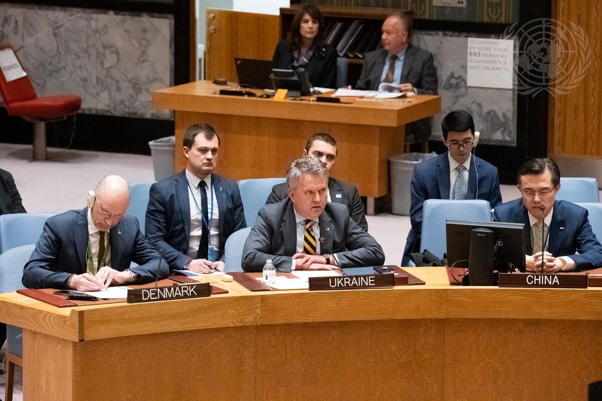Sergiy Kyslytsya (centre at table), Permanent Representative of Ukraine to the United Nations. addresses the Security Council meeting on maintenance of peace and security of Ukraine.