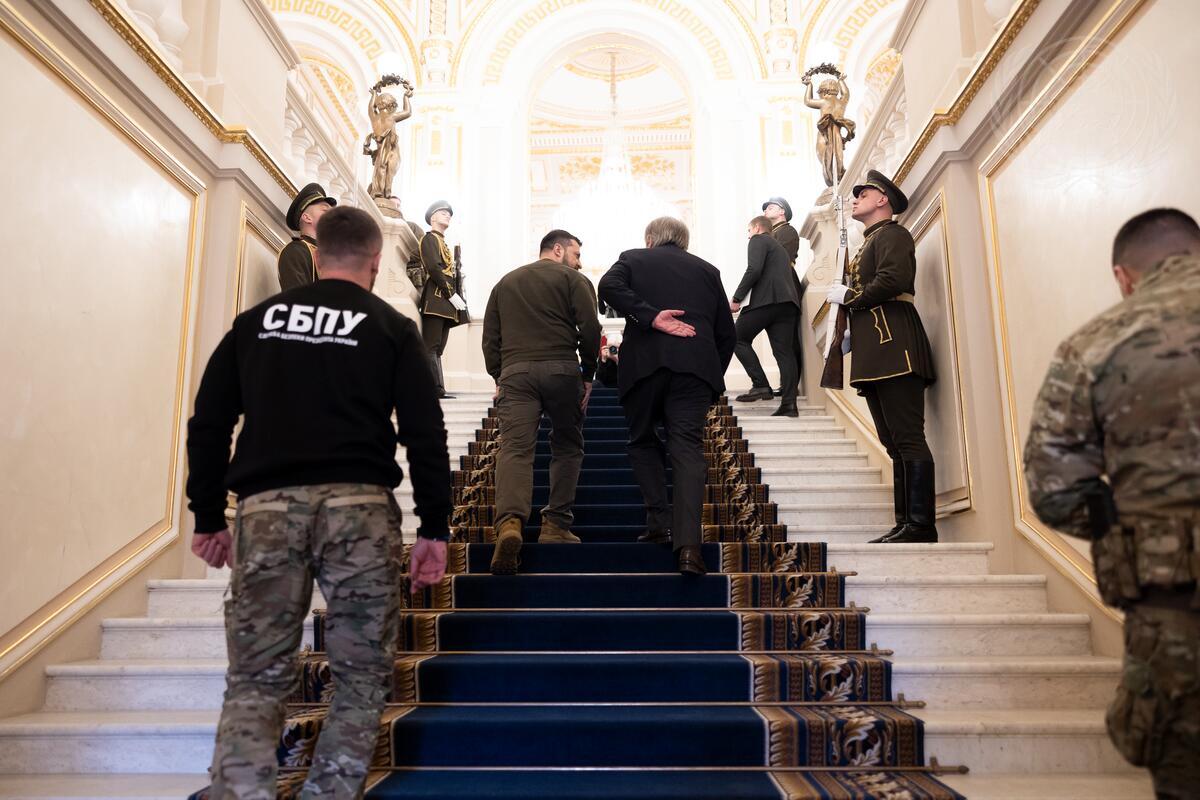 Secretary-General António Guterres (centre right) meets with Volodymyr Zelenskyy (centre left), President of Ukraine.