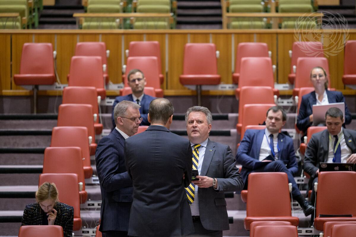 A view of delegates during the Security Council meeting on maintenance of peace and security of Ukraine. Standing at right is Sergiy Kyslytsya, Permanent Representative of Ukraine to the United Nations.