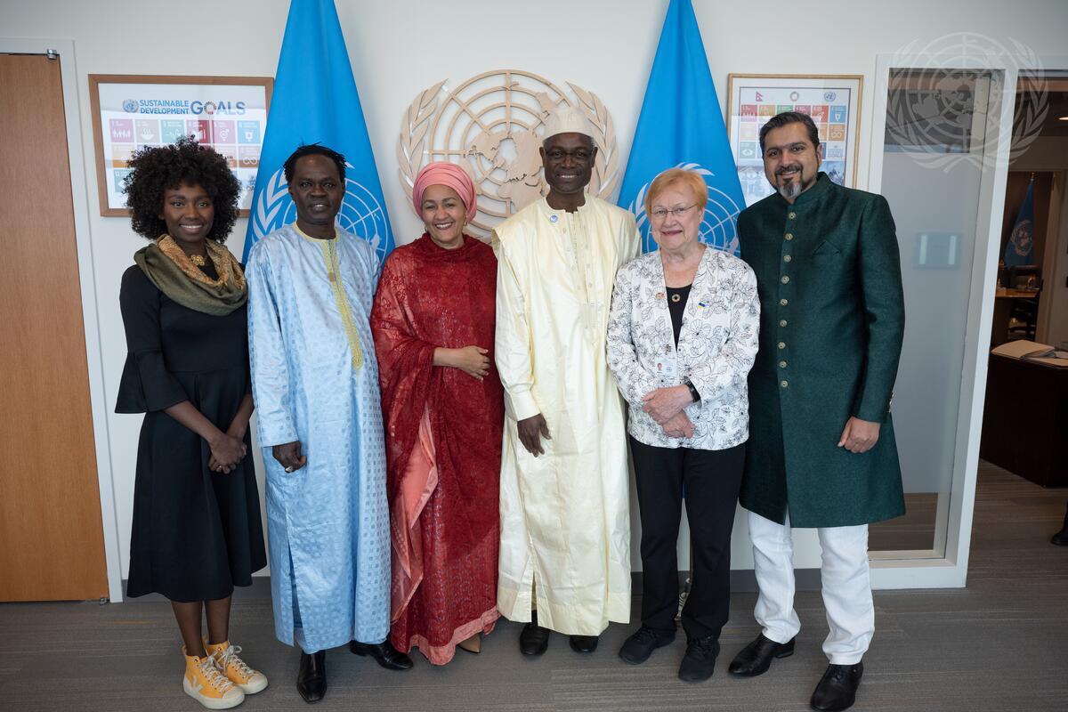 From left to right: Inna Modja, Goodwill Ambassador with United Nations Convention to Combat Desertification (UNCCD); Baaba Maal, Singer and UNCCD Goodwill Ambassador; Deputy Secretary-General Amina Mohammed; Ibrahim Thiaw, Executive Secretary of UNCCD; Tarja Halonen, Former President of Finland and Land Ambassador of UNCCD; and Ricky Kej, Artist and UNCCD Goodwill Ambassador.