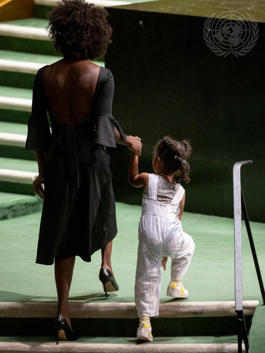 Inna Modja, Land Ambassador with United Nations Convention to Combat Desertification (UNCCD), actress, singer and environmental activist, with her daughter Valentina, walks up on the podium to address the event “Her Land. Her Rights: Advancing Gender Equality and Land Restoration Goals”. The high-level event marks the 2023 Desertification and Drought Day with a focus on policies and actions needed to advance women’s land rights and promote stronger female leadership and decision-making power in sustainable land management.