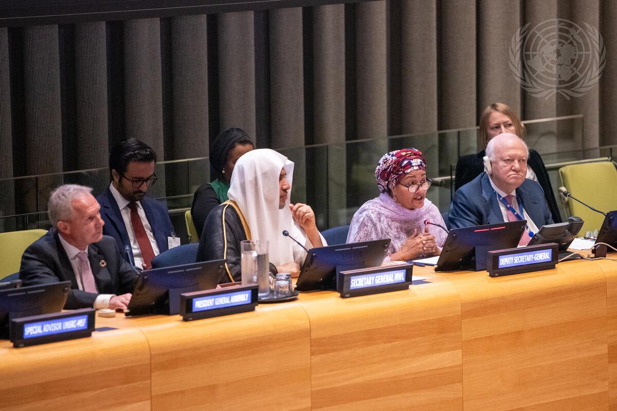 Deputy Secretary-General Amina Mohammed (centre right) speaks during the Intercultural and interreligious dialogue and panel discussion on “Building Bridges between East and West”.