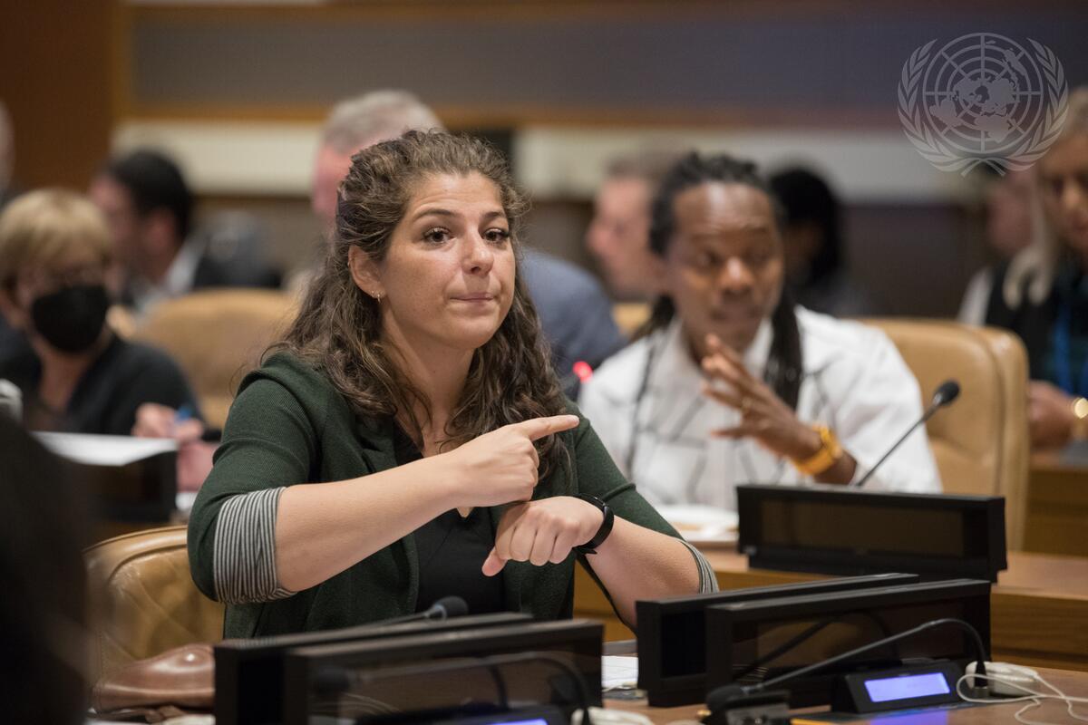 A sign language interpreter (left) interprets for David Sengeh (right), Minister of Basic and Senior Secondary Education of Sierra Leone and Co-Chair of the Summit Advisory Committee and the SDG4 High-Level Steering Committee Sherpa Group, during the session held on “Transforming Commitments into Real Solutions for Disability- Inclusive Education” during the second day of the Transforming Education Summit.
