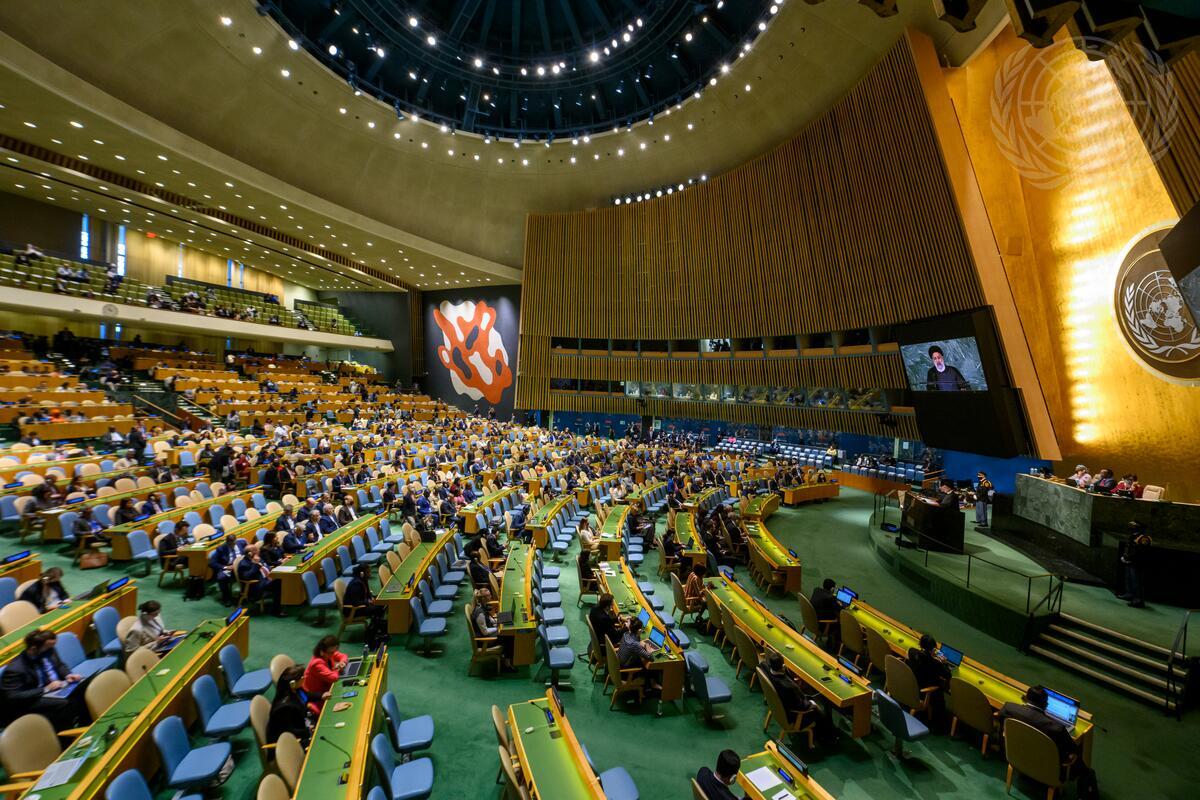 A wide view of the General Assembly Hall as Seyyed Ebrahim Raisi (on screen and at right at podium), President of the Islamic Republic of Iran, addresses the general debate of the General Assembly’s seventy-seventh session.