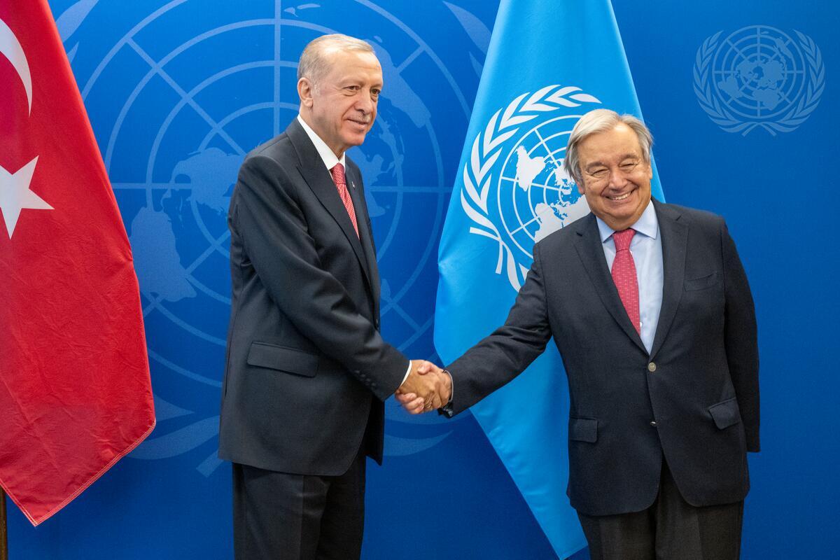 Secretary-General António Guterres (right) meets with Recep Tayyip Erdoğan, President of the Republic of Türkiye, during the seventy-seventh session of the General Assembly Debate.