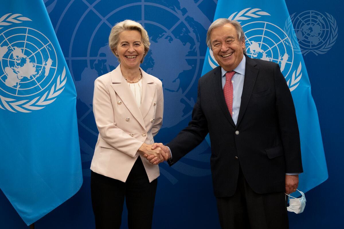 Secretary-General António Guterres (right) meets with Ursula von der Leyen, President of European Commission.