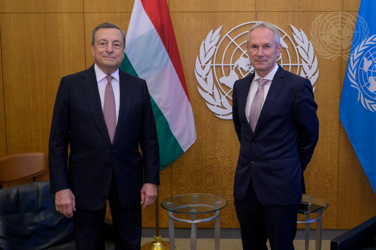 Csaba Kőrösi (right), President of the seventy-seventh session of the United Nations General Assembly, meets with Mario Draghi, President of the Council of Ministers of the Republic of Italy.