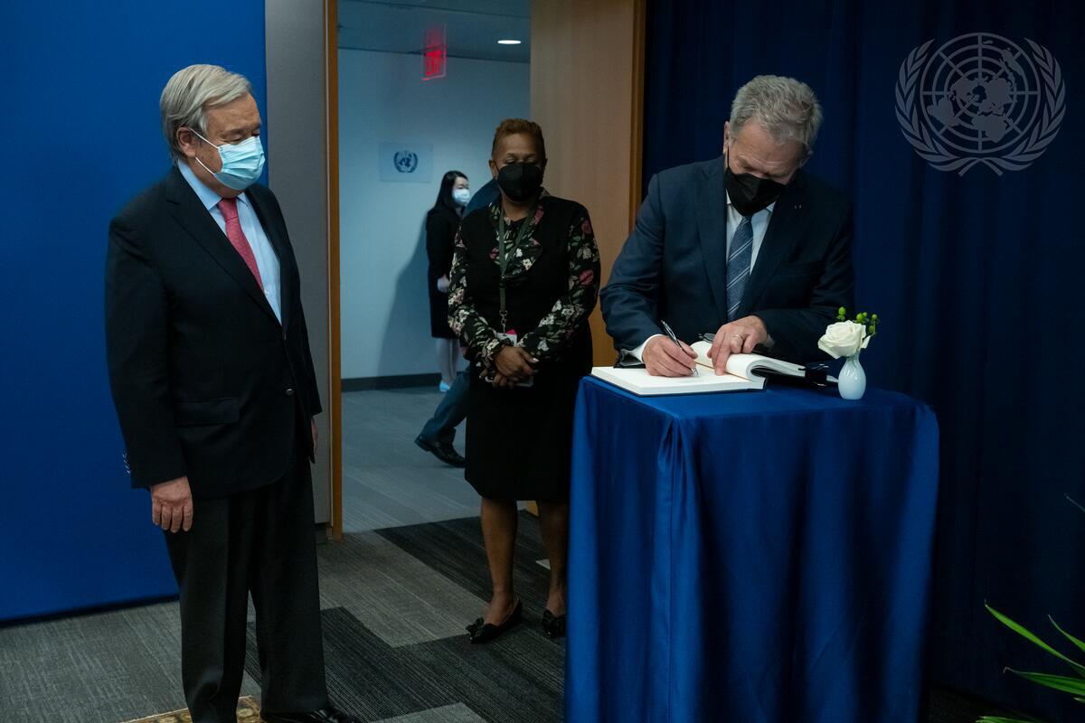 Secretary-General António Guterres (left) meets with Sauli Niinistö (right), President of the Republic of Finland, during the seventy-seventh session of the General Assembly Debate.