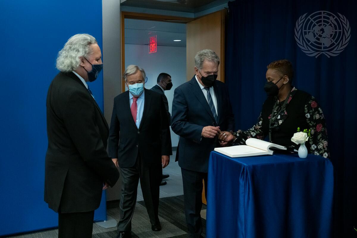 Secretary-General António Guterres (centre) meets with Sauli Niinistö (at table), President of the Republic of Finland, during the seventy-seventh session of the General Assembly Debate.