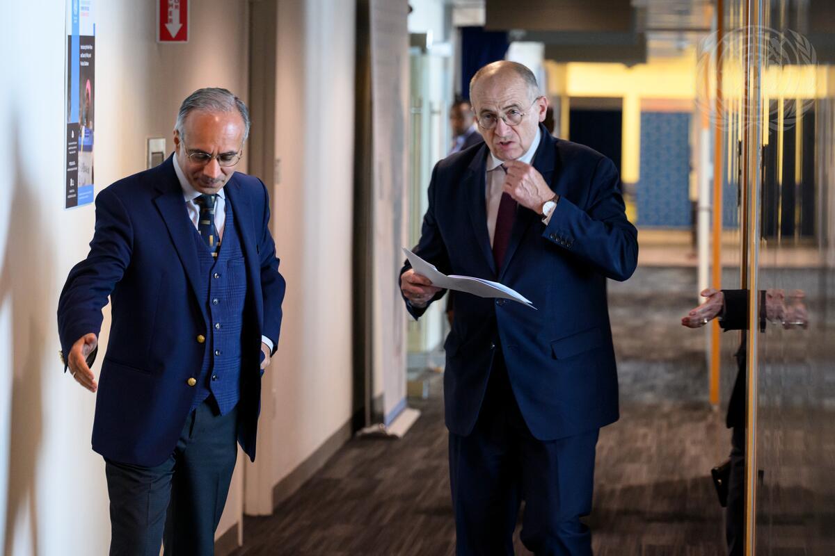 Zbigniew Rau (right), Minister for Foreign Affairs of the Republic of Poland, walks to a meeting with Secretary-General António Guterres (not in photo).