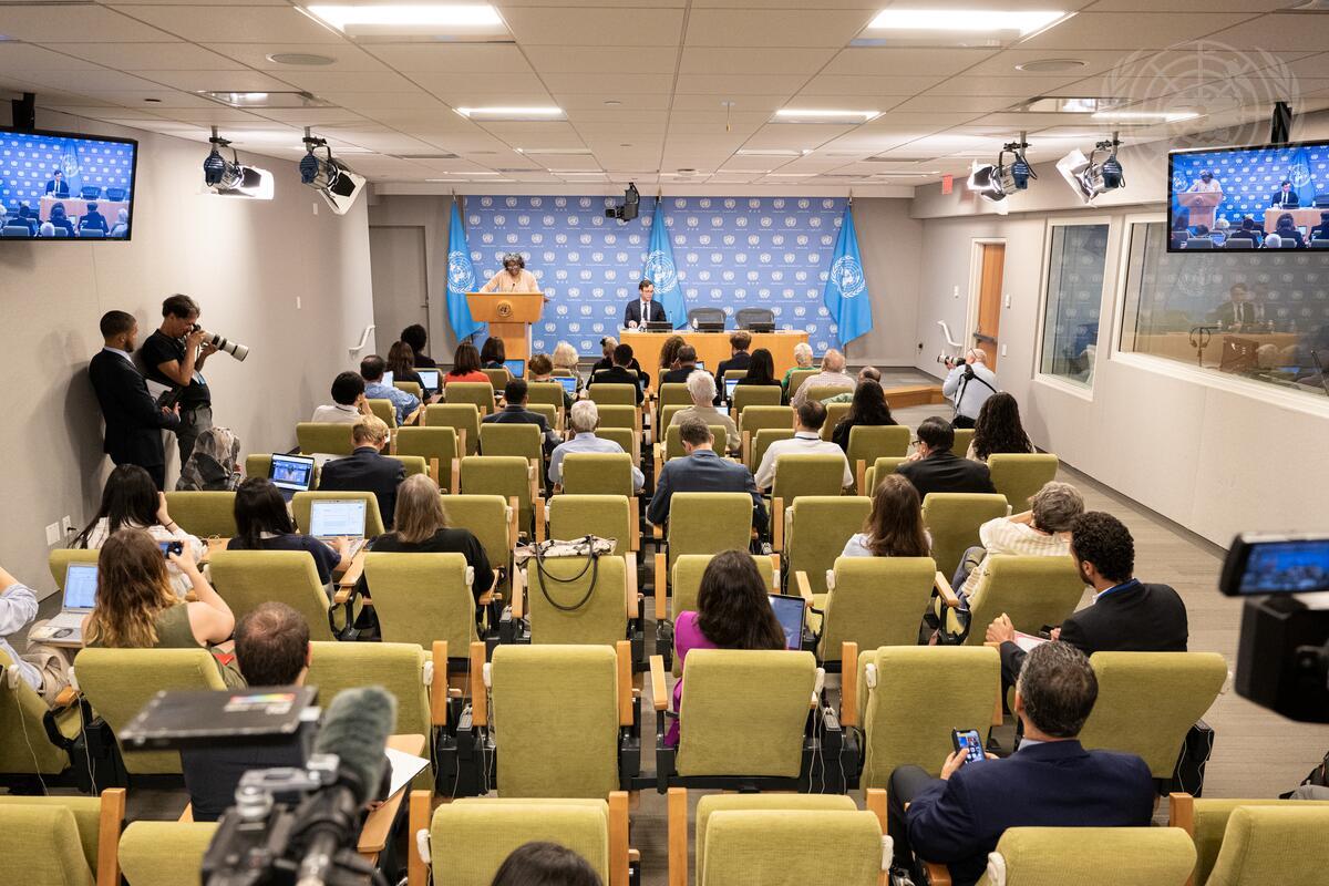 Linda Thomas-Greenfield (at podium), Permanent Representative of the United States to the United Nations and President of the Security Council for the month of August, briefs reporters on the programme of work of the Security Council for the month.
