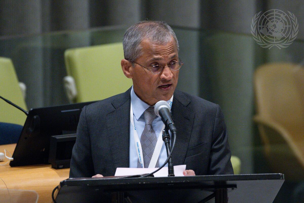 Burhan Gafoor, Permanent Representative of Singapore to the United Nations, introduces draft resolution (A/77/L.82) titled "Agreement under the United Nations Convention on the Law of the Sea on the conservation and sustainable use of marine biological diversity of areas beyond national jurisdiction" during the General Assembly meeting on Oceans and the law of the sea. The General Assembly adopted draft resolution.