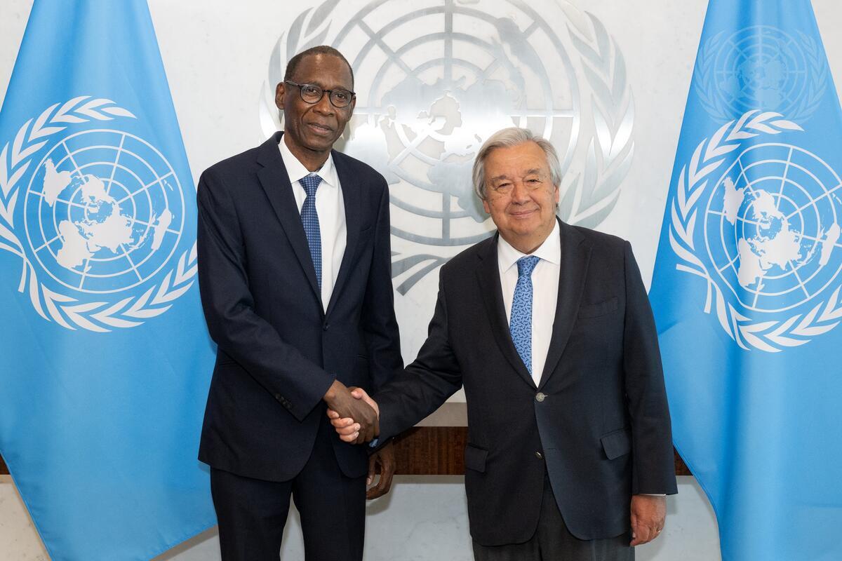 Secretary-General António Guterres (right) meets with Cheikh Niang, Chair of the Committee on the Exercise of the Inalienable Rights of the Palestinian People.