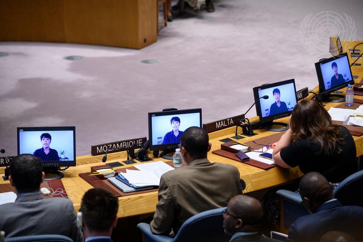 Noura Al Jerbi (on screens), Civil society briefer, briefs the Security Council meeting on the situation in Libya.