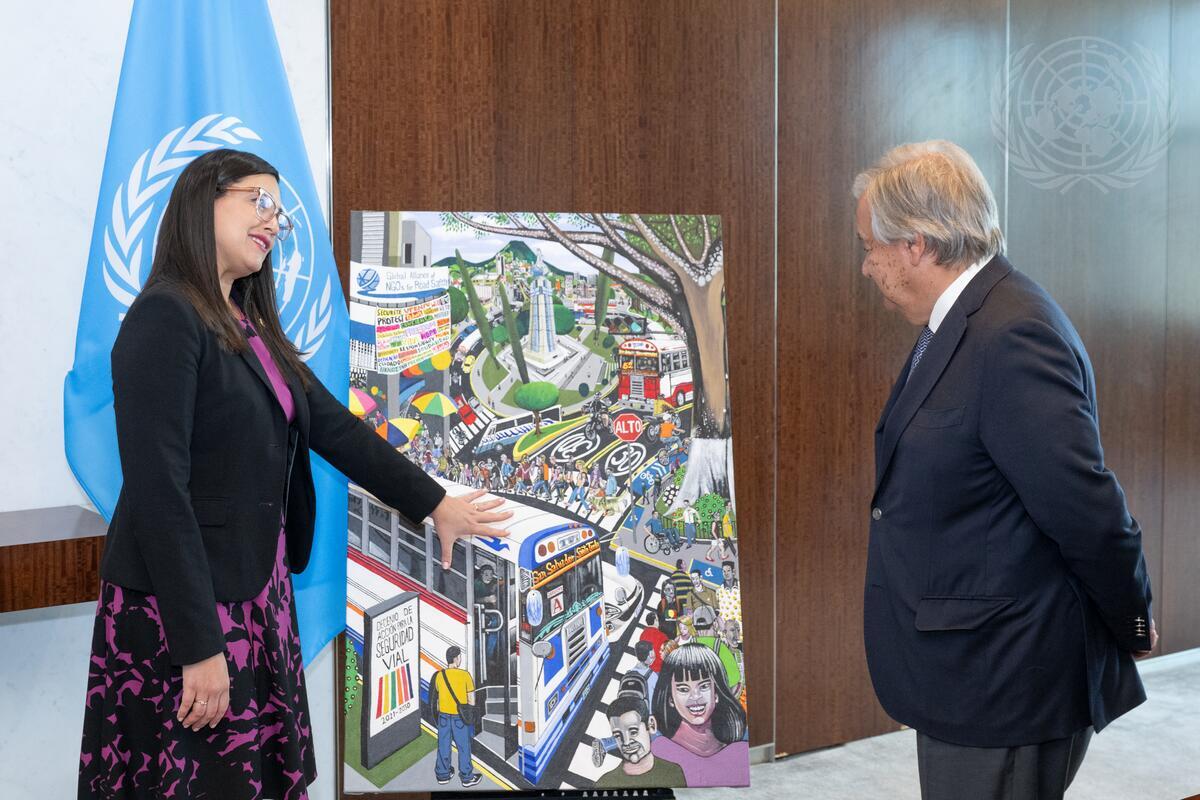 Egriselda Aracely González López (left), Permanent Representative of El Salvador to the United Nations, presents a painting to Secretary-General António Guterres.