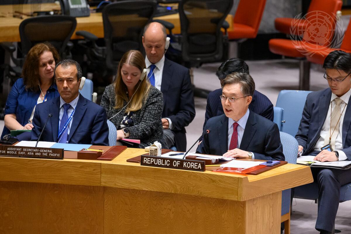 Joonkook Hwang (right at table), Permanent Representative of the Republic of Korea to the United Nations, addresses the Security Council meeting on non-proliferation and the Democratic People’s Republic of Korea. At left at table is Khaled Khiari, Assistant Secretary-General for Middle East, Asia and the Pacific in the Departments of Political and Peacebuilding Affairs and Peace Operations.