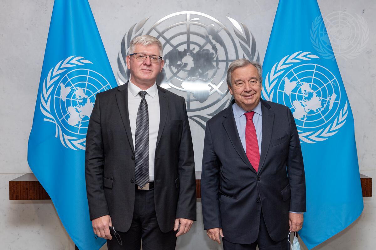 Secretary-General António Guterres (right) meets with Leonid Frolov, Executive Director of the United Nations Register of Damage Caused by the Construction of the Wall in the Occupied Palestinian Territory (UNROD).
