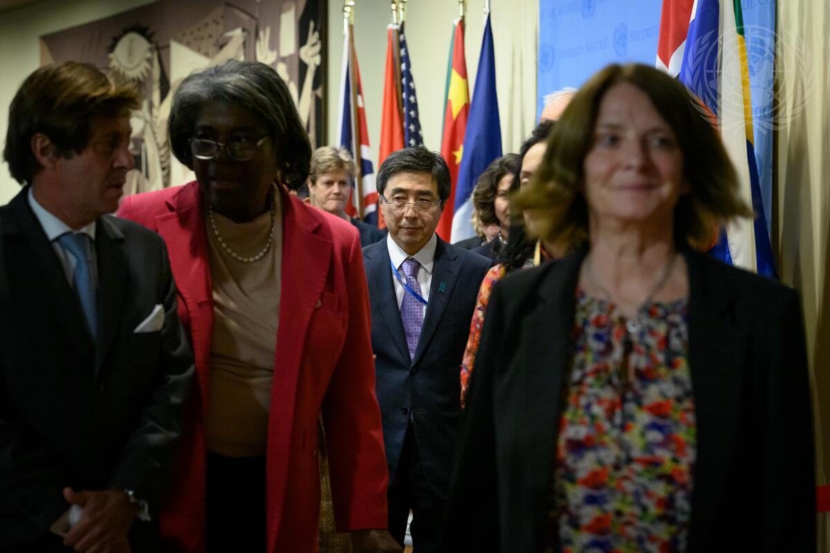 At second from left is Linda Thomas-Greenfield, Permanent Representative of the United States to the United Nations, speaking with Nicolas de Rivière (left), Permanent Representative of France to the United Nations. At right is Mona Juul, Permanent Representative of Norway to the United Nations, and in the centre is Kimihiro Ishikane, Permanent Representative of Japan to the United Nations.