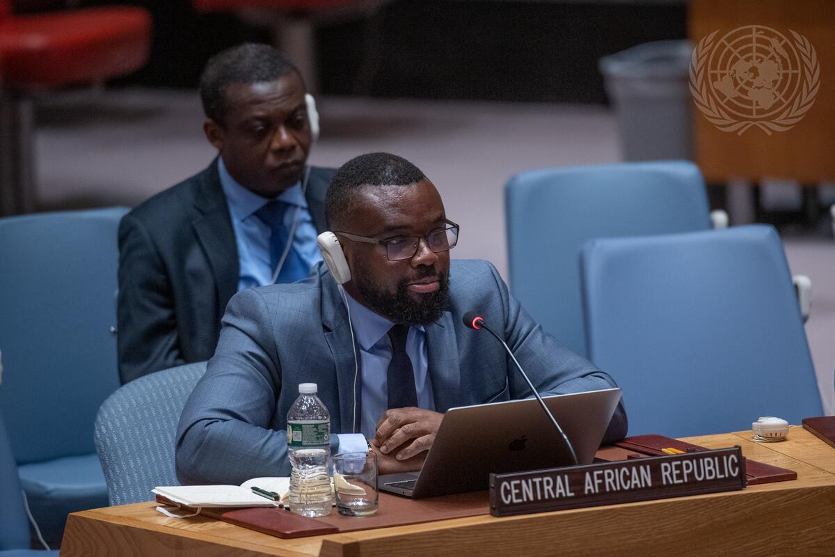 Marius Aristide Hoja Nzessioue, Counsellor of the Permanent Mission of the Central African Republic to the United Nations, addresses the Security Council meeting on peace and security in Africa. The meeting focuses on strengthening the fight against the financing of armed groups and terrorists through the illicit trafficking of natural resources.