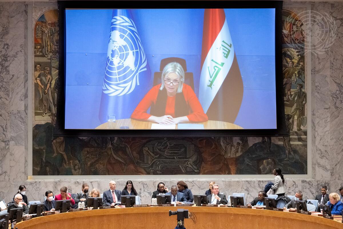 Jeanine Hennis-Plasschaert (on screen), Special Representative of the Secretary-General and Head of the United Nations Assistance Mission for Iraq, briefs the Security Council meeting on the situation concerning Iraq.