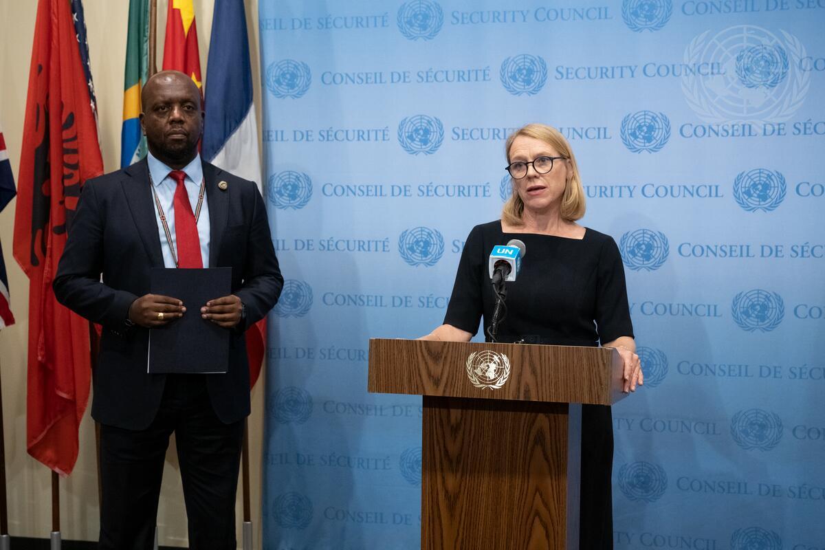 Anniken Huitfeldt (at podium), Foreign Minister of Norway, and Martin Kimani, Permanent Representative of Kenya, brief reporters ahead of the Security Council meeting on climate and security in Africa. Norway and Kenya are co-chairs of the UN Security Council informal expert group on Climate and Security.