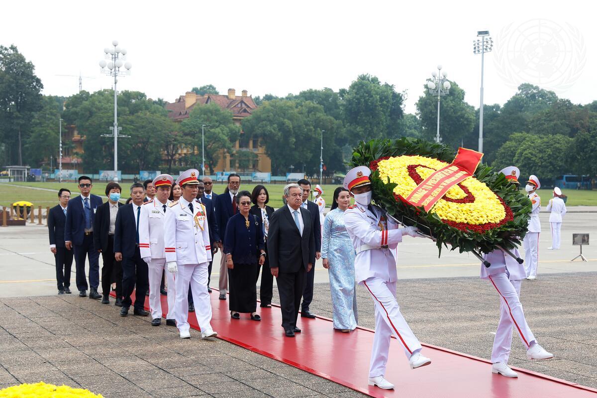 Secretary-General António Guterres (centre of picture) attends a ceremony at the mausoleum of late Vietnamese President Ho Chi Minh in Hanoi, Viet Nam.