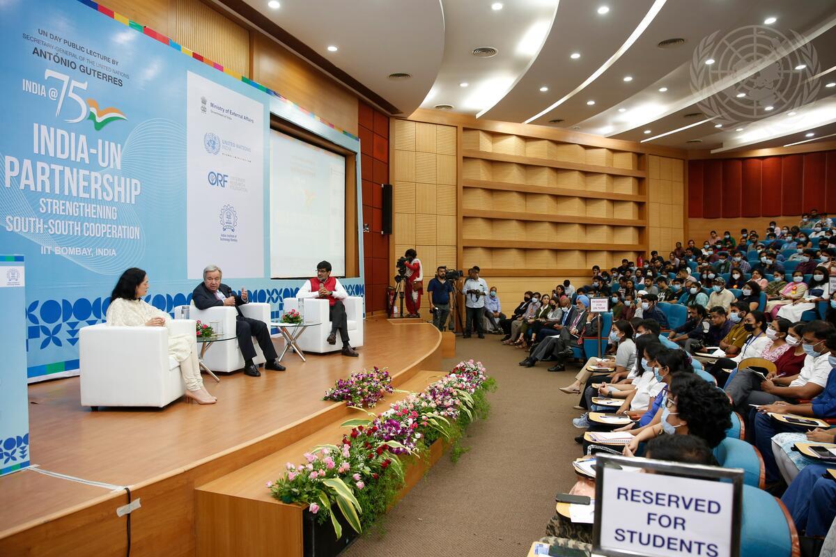 Secretary-General António Guterres (centre at dais) is taking part in the UN Day Public Lecture at the Indian Institute of Technology Bombay (IIT) in Mumbai, India, on the seventy-fifth anniversary of India’s independence, India UN Partnership, and Strengthening South-South Cooperation in Mumbai, India.